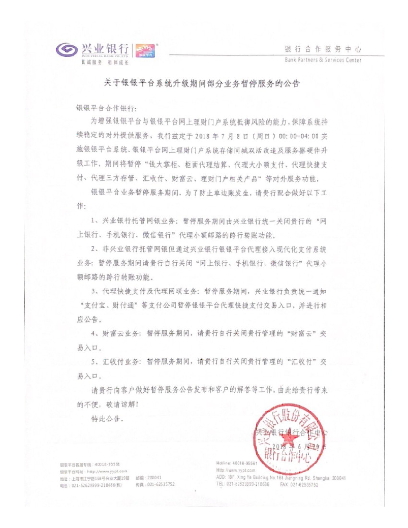 轉(zhuǎn)發(fā)關(guān)于《銀銀平臺(tái)系統(tǒng)升級期間部分業(yè)務(wù)暫停服務(wù)的公告》 日期:2018-07-06 09:24:15 上一篇 返回 下一篇