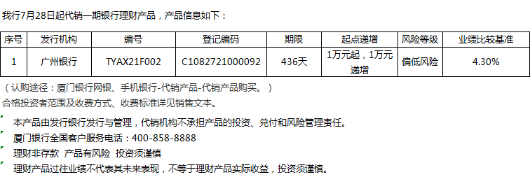 廈門銀行7月28日代銷廣州銀行理財產(chǎn)品信息