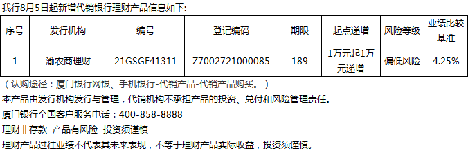 廈門銀行8月5日代銷渝農(nóng)商理財(cái)理財(cái)產(chǎn)品信息