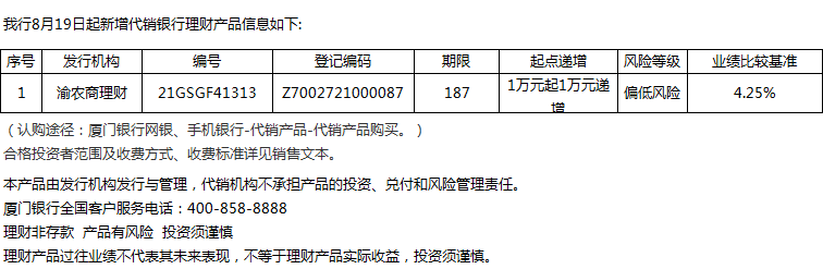 廈門銀行8月19日代銷渝農(nóng)商理財理財產(chǎn)品信息