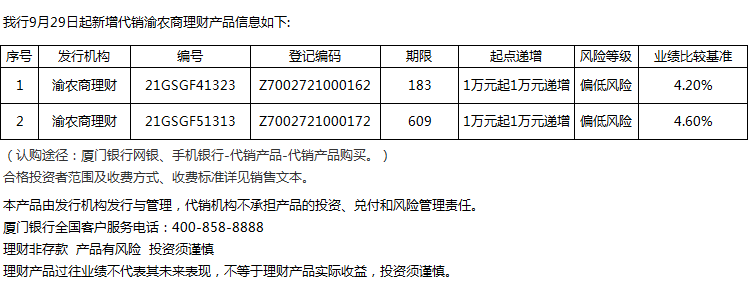 廈門(mén)銀行9月29日代銷(xiāo)渝農(nóng)商理財(cái)產(chǎn)品信息
