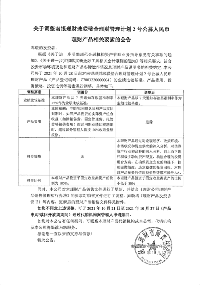 關(guān)于調(diào)整南銀理財珠聯(lián)璧合理財管理計劃2號公募人民幣理財產(chǎn)品相關(guān)要素的公告