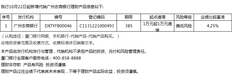 廈門(mén)銀行10月22日代銷廣州農(nóng)商銀行理財(cái)產(chǎn)品信息