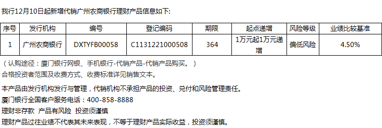 廈門銀行12月10日代銷廣州農(nóng)商銀行理財(cái)產(chǎn)品信息