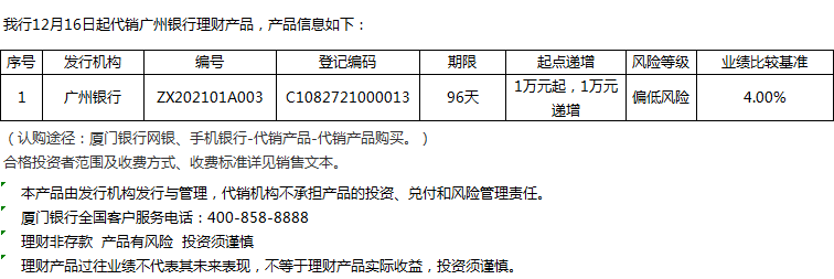 廈門銀行12月16日代銷廣州銀行理財產(chǎn)品信息