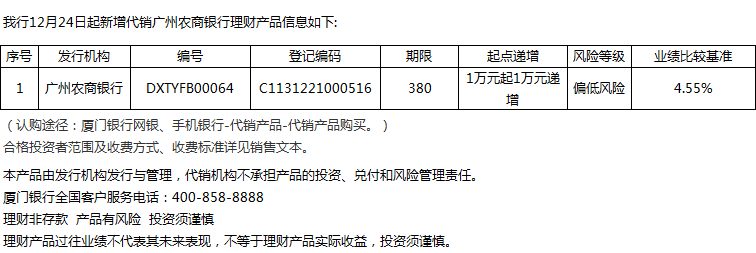廈門銀行12月24日代銷廣州農(nóng)商銀行理財產(chǎn)品信息