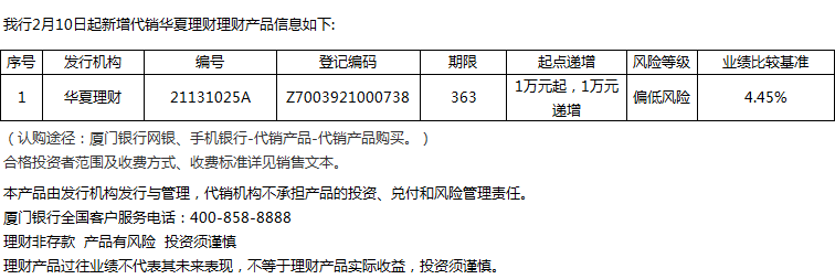 廈門銀行2月10日代銷華夏理財(cái)理財(cái)產(chǎn)品信息