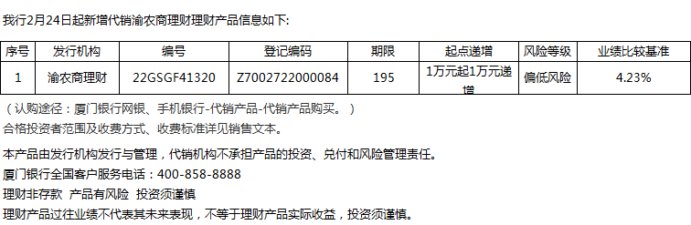 廈門銀行2月24日代銷渝農(nóng)商理財(cái)理財(cái)產(chǎn)品信息