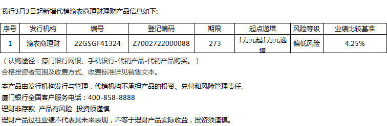 廈門銀行3月3日代銷渝農(nóng)商理財(cái)理財(cái)產(chǎn)品信息