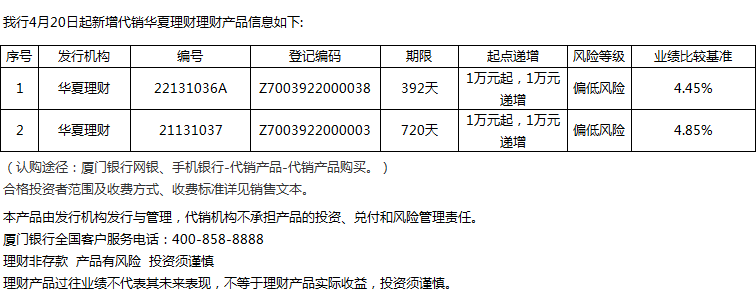 廈門銀行4月20日代銷華夏理財理財產(chǎn)品信息