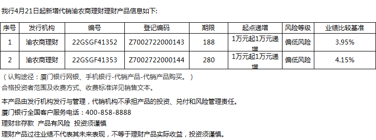 廈門銀行4月21日代銷渝農(nóng)商理財(cái)理財(cái)產(chǎn)品信息