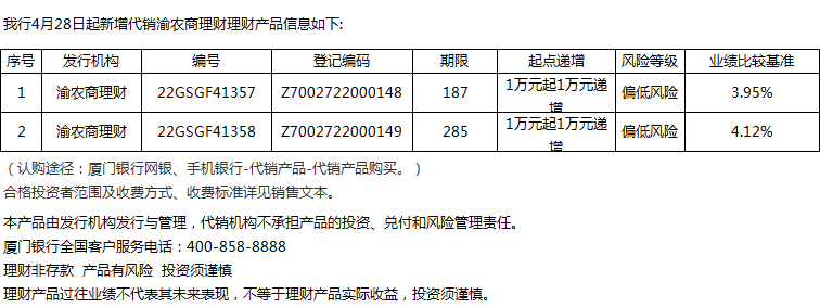 廈門(mén)銀行4月28日代銷渝農(nóng)商理財(cái)理財(cái)產(chǎn)品信息