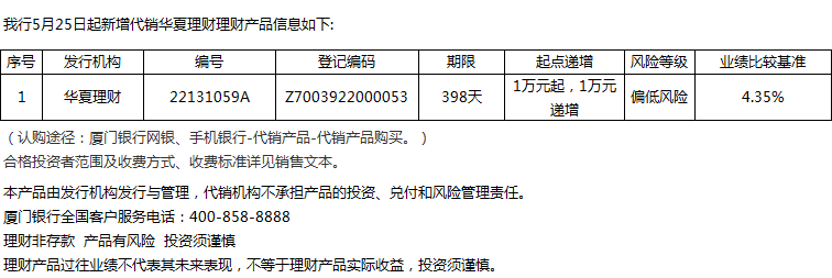 廈門銀行5月25日代銷華夏理財(cái)理財(cái)產(chǎn)品信息