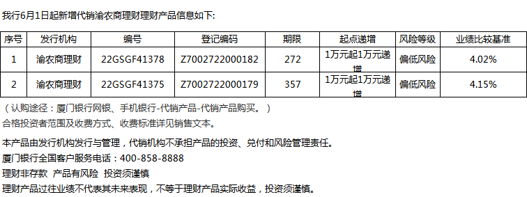 廈門銀行6月1日代銷渝農(nóng)商理財(cái)理財(cái)產(chǎn)品信息