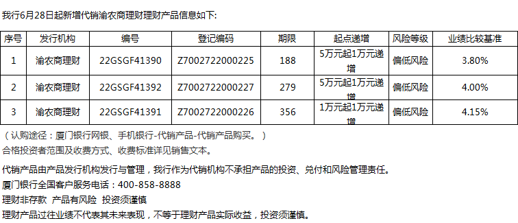 廈門銀行6月28日代銷渝農(nóng)商理財(cái)理財(cái)產(chǎn)品信息