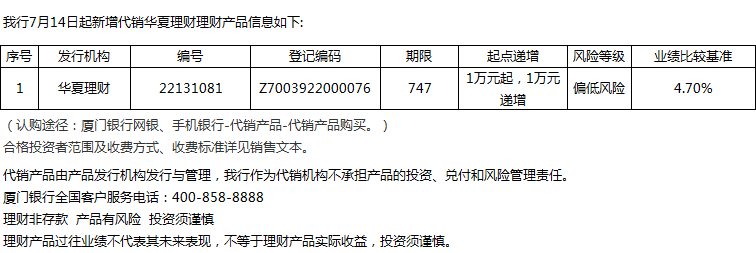 廈門銀行7月14日代銷華夏理財(cái)理財(cái)產(chǎn)品信息