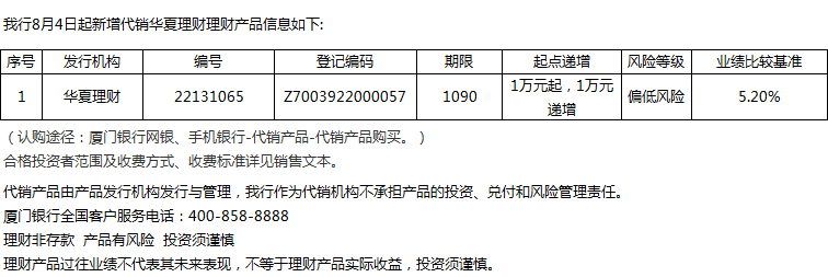 廈門銀行8月4日代銷華夏理財理財產(chǎn)品信息