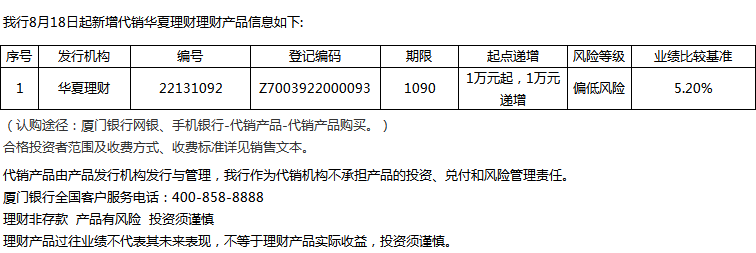 廈門銀行8月18日代銷華夏理財(cái)理財(cái)產(chǎn)品信息