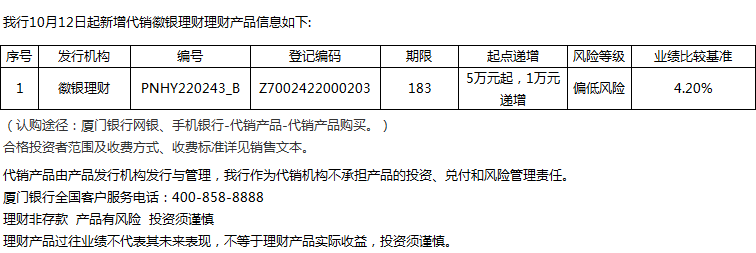 廈門銀行10月12日代銷徽銀理財(cái)理財(cái)產(chǎn)品信息