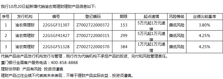 廈門銀行10月20日代銷渝農(nóng)商理財理財產(chǎn)品信息