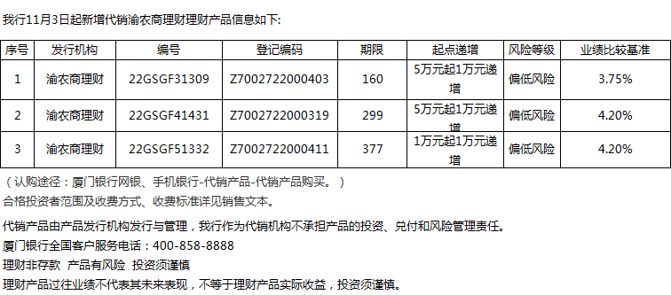 廈門銀行11月3日代銷渝農(nóng)商理財理財產(chǎn)品信息