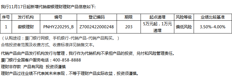 廈門銀行11月17日代銷徽銀理財(cái)理財(cái)產(chǎn)品信息