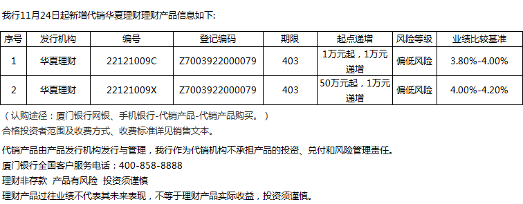 廈門銀行11月24日代銷華夏理財理財產(chǎn)品信息