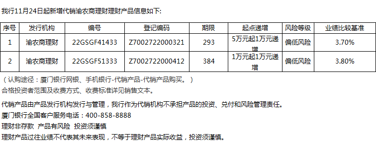 廈門銀行11月24日代銷渝農(nóng)商理財(cái)理財(cái)產(chǎn)品信息