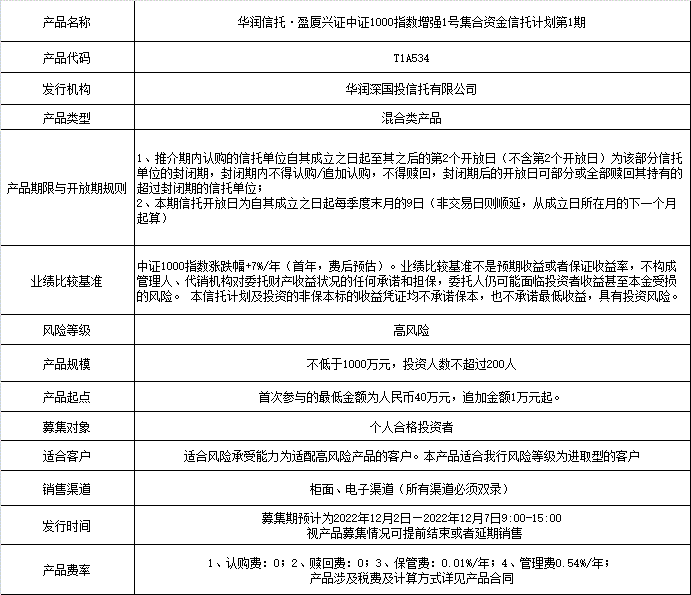 我行將代銷《華潤信托·盈廈興證中證1000指數(shù)增強1號集合資金信托計劃第1期》,產(chǎn)品信息如下: