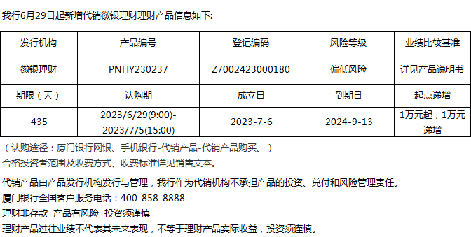 廈門銀行6月29日代銷徽銀理財(cái)理財(cái)產(chǎn)品信息