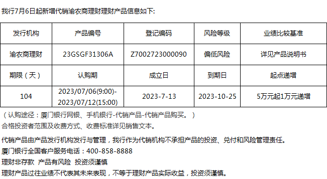 廈門銀行7月6日代銷渝農商理財理財產品信息