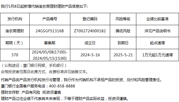 廈門銀行5月8日代銷渝農(nóng)商理財(cái)理財(cái)產(chǎn)品信息