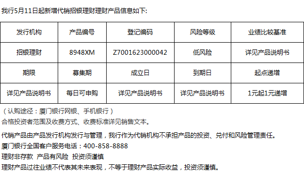 廈門銀行5月11日代銷招銀理財(cái)理財(cái)產(chǎn)品信息
