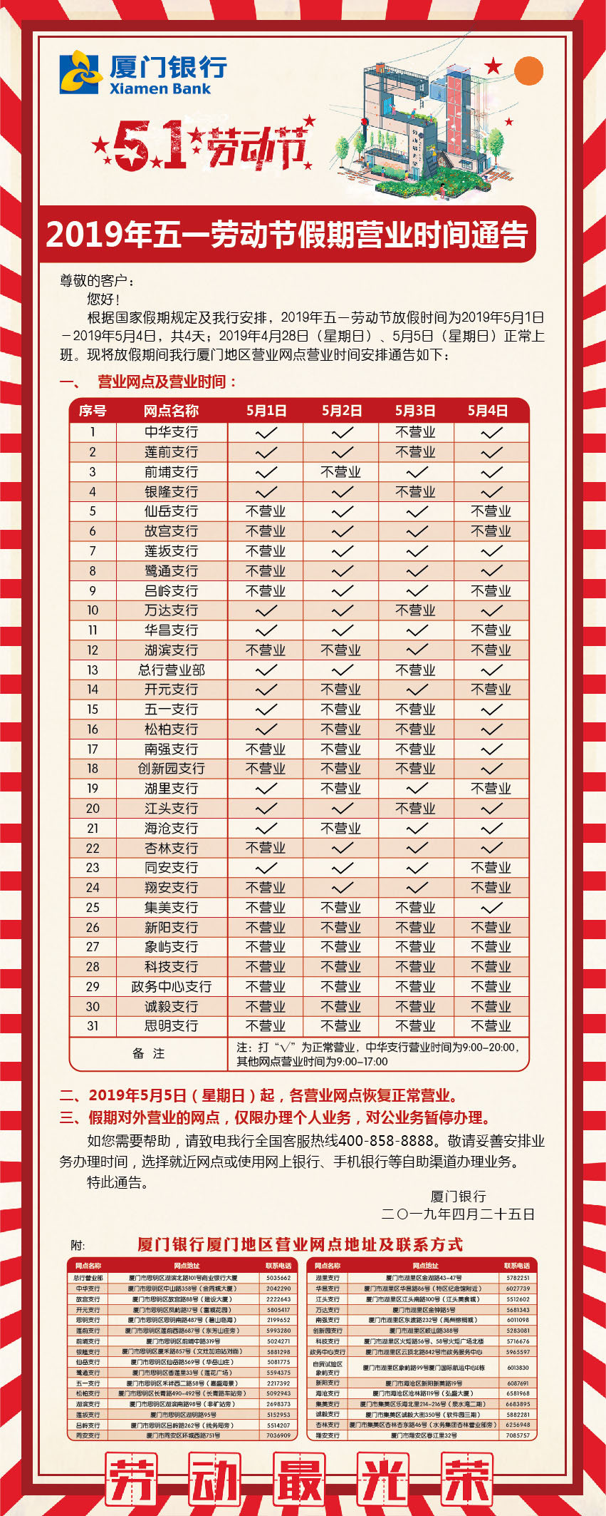 2019年廈門銀行廈門地區(qū)五一假期各網(wǎng)點(diǎn)營業(yè)時(shí)間