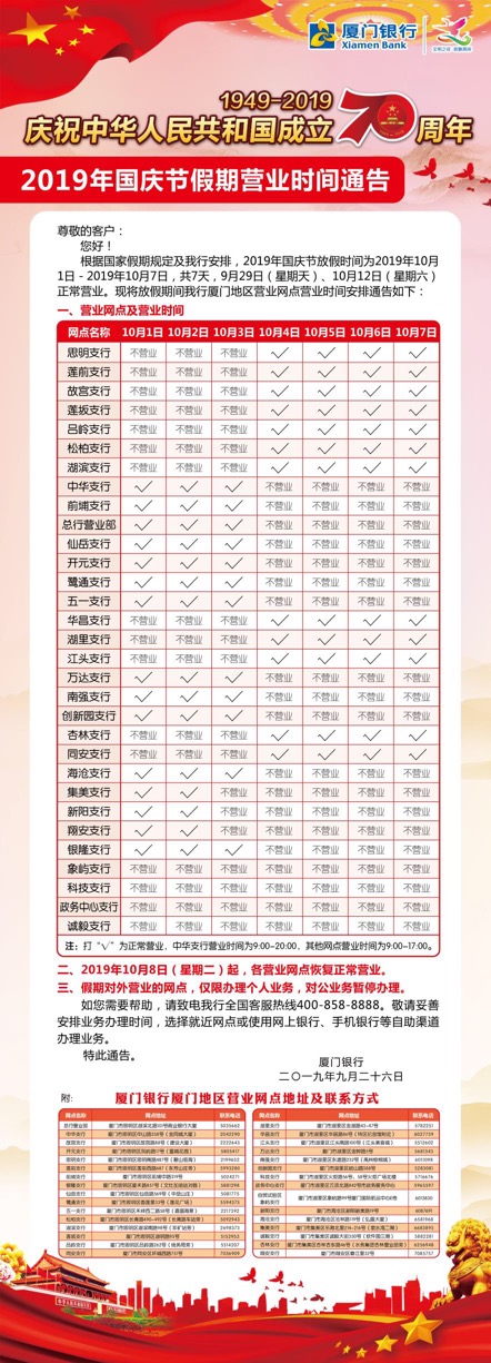2019年國(guó)慶節(jié)假期營(yíng)業(yè)時(shí)間通告