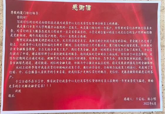 “今年4月份,我姐夫的企業(yè)因為疫情的影響,資金鏈上受到了打擊,期間我臨時受命前往上海馳援抗“疫”,廈門銀行予以了全力幫助,通過綠色審查通道履行信貸審查,特事特辦、急事急辦,為我姐夫的企業(yè)解決了融資難題。同時我也是廈門銀行的一位客戶,對銀行的服務態(tài)度及工作效率一直是非常滿意的,員工們都是笑臉相迎,竭盡為我們客戶所想,內(nèi)心一直想表示感謝,給你們點贊!”林醫(yī)生和的千言萬語匯成“感謝”二字。