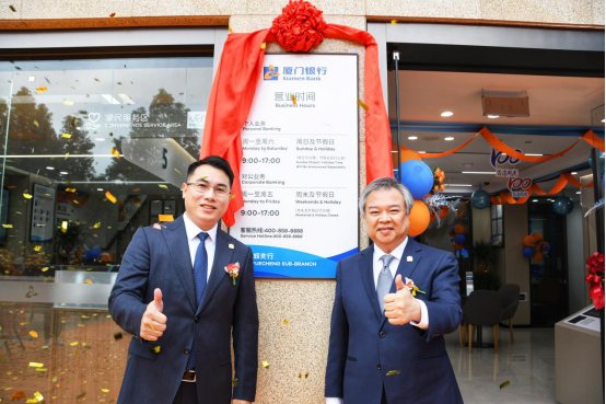 廈門銀行行長吳昕顥、灣悅城支行行長黃恒福共同為支行開業(yè)揭牌