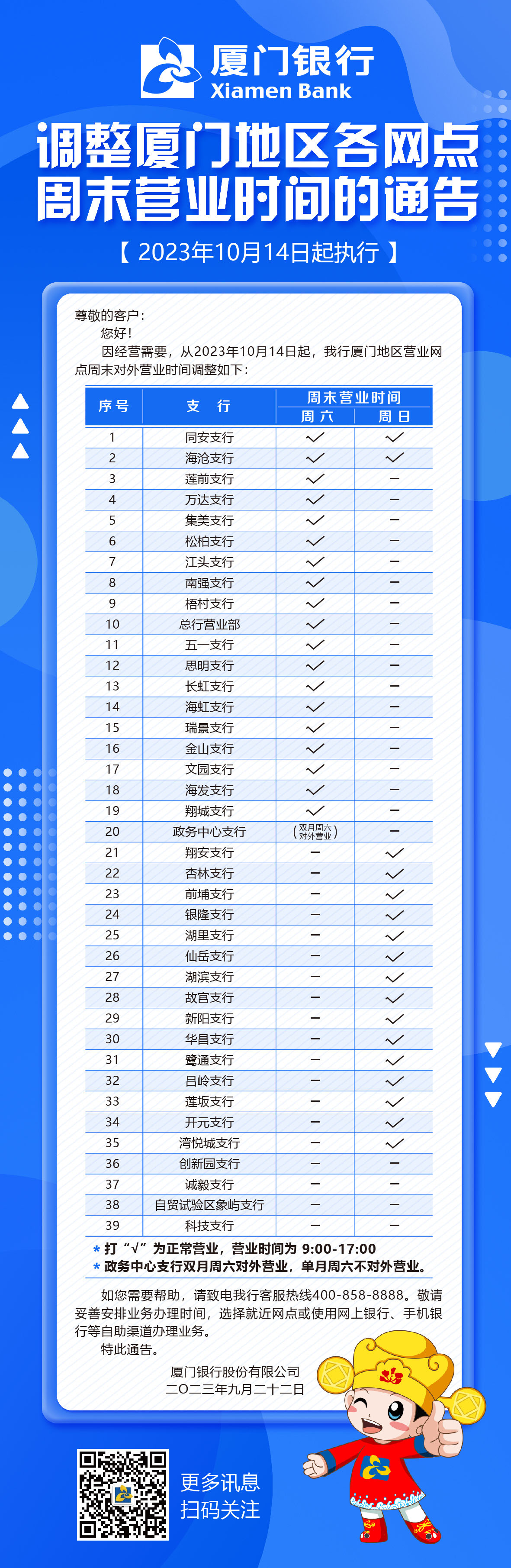 廈門銀行關(guān)于調(diào)整廈門地區(qū)各網(wǎng)點(diǎn)周末營業(yè)時間的通告