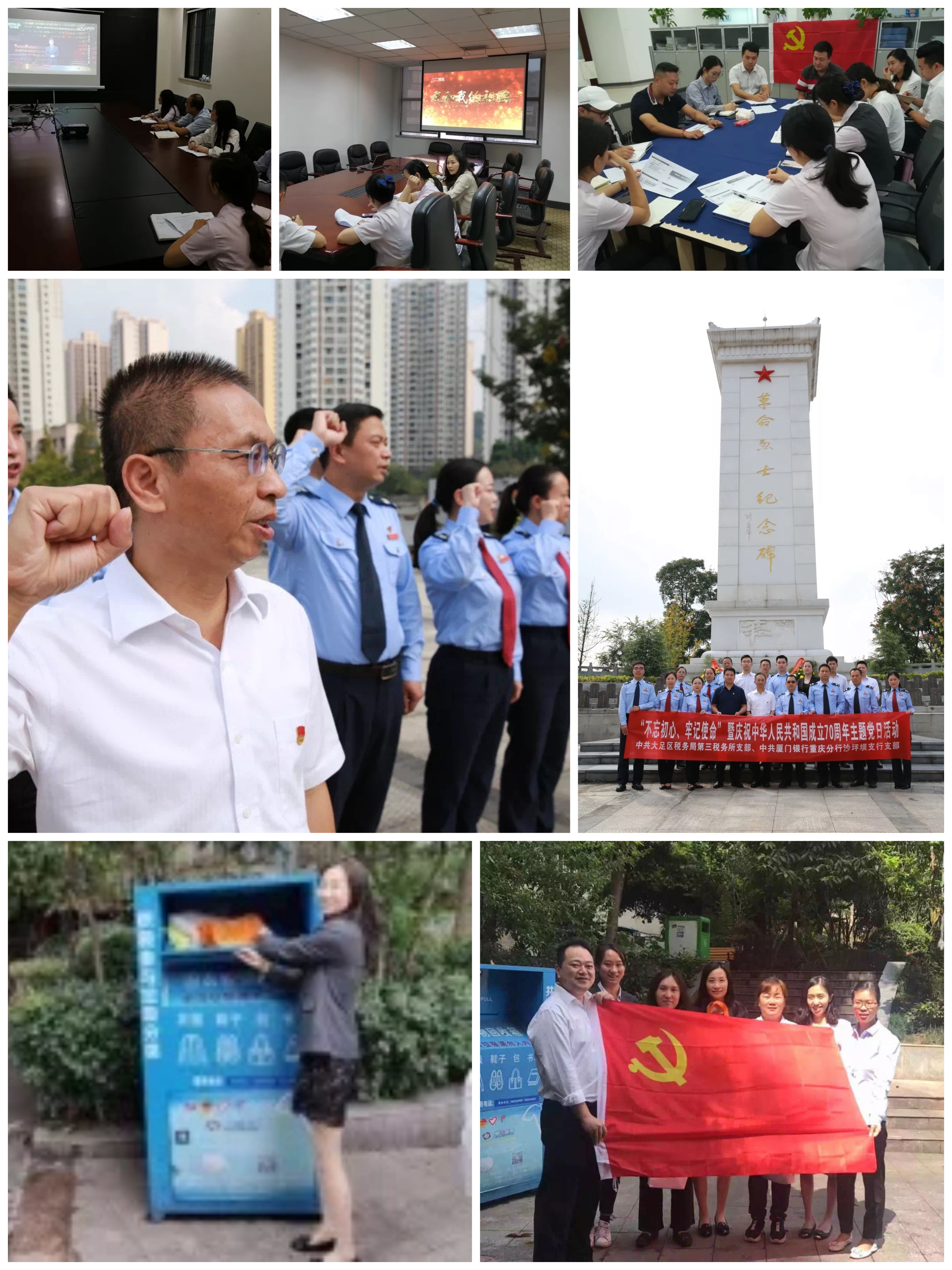 期間,分行第一支部黨員積極發(fā)動(dòng)身邊同事,組織開(kāi)展了捐贈(zèng)舊衣活動(dòng),為市區(qū)困難群體獻(xiàn)愛(ài)心、送溫暖。沙坪壩支部走進(jìn)周邊社區(qū)拾撿垃圾、美化環(huán)境,傳遞環(huán)保理念,并密切聯(lián)系當(dāng)?shù)囟悇?wù)機(jī)關(guān)黨組織開(kāi)展慶國(guó)慶暨主題教育黨日活動(dòng),參觀了烈士陵園并舉行了座談會(huì),以對(duì)初心的守護(hù)緬懷革命英烈。第三支部及兩江支部分別開(kāi)展了國(guó)慶觀影活動(dòng),組織觀看了“國(guó)家記憶”欄目、《紅色故事》系列短片溫習(xí)歷史,回顧新中國(guó)偉大成就。南岸支部開(kāi)展了重溫入黨誓言主題黨日活動(dòng),激勵(lì)黨員以誓言為鏡,審視自身,強(qiáng)化責(zé)任擔(dān)當(dāng)。其他支部亦開(kāi)展了愛(ài)國(guó)主題座談會(huì)、集體觀看閱兵式、齊唱《我和我的祖國(guó)》等活動(dòng)抒發(fā)愛(ài)國(guó)情懷,獻(xiàn)禮祖國(guó)華誕。