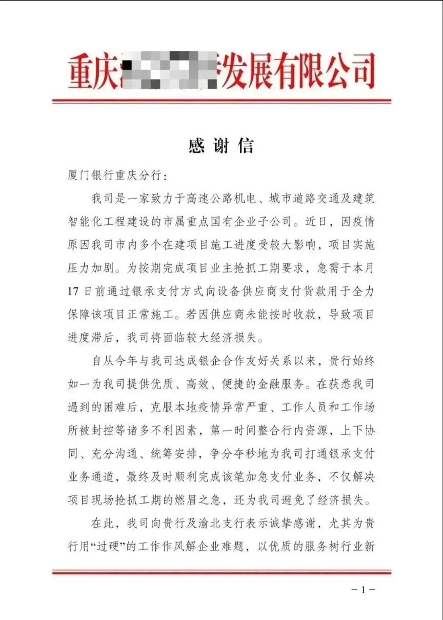 廈門銀行重慶分行收到企業(yè)客戶感謝信