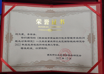 近日,重慶分行在江北區(qū)稅務(wù)學(xué)會(huì)、江北區(qū)國(guó)際稅收研究會(huì)(簡(jiǎn)稱“稅兩會(huì)”)聯(lián)合舉辦的“2022年稅收學(xué)術(shù)年會(huì)”中,憑借撰寫報(bào)送的《我國(guó)城市商業(yè)銀行稅務(wù)管理存在的問(wèn)題及對(duì)策研究》在110余篇論文中脫穎而出,榮獲本次年會(huì)三等獎(jiǎng)。