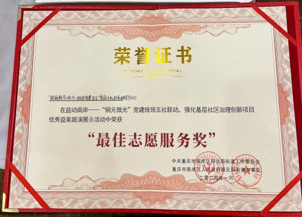 廈門銀行重慶南岸支行在社區(qū)黨建優(yōu)秀案例申報活動中榮獲 “最佳志愿服務(wù)獎”