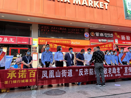 2022年10月14日上午,鳳凰山街道以全國(guó)“敬老月”為契機(jī),聯(lián)合城廂公安分局反詐中心、禁毒大隊(duì)、鳳凰山派出所等部門(mén)在南園社區(qū)農(nóng)貿(mào)市場(chǎng)鳳凰百貨超市門(mén)口開(kāi)展"反詐防騙,敬老助老"、常態(tài)化掃黑除惡、全民禁毒等宣傳活動(dòng),廈門(mén)銀行莆田城廂支行積極參與其中。活動(dòng)期間,支行宣傳人員通過(guò)發(fā)放宣傳單、宣傳禮品等多樣化的宣傳方式,向公眾介紹常見(jiàn)的詐騙手段,讓大家深知詐騙的危害。