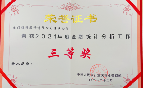 重慶分行榮獲2021年金融統(tǒng)計分析工作三等獎