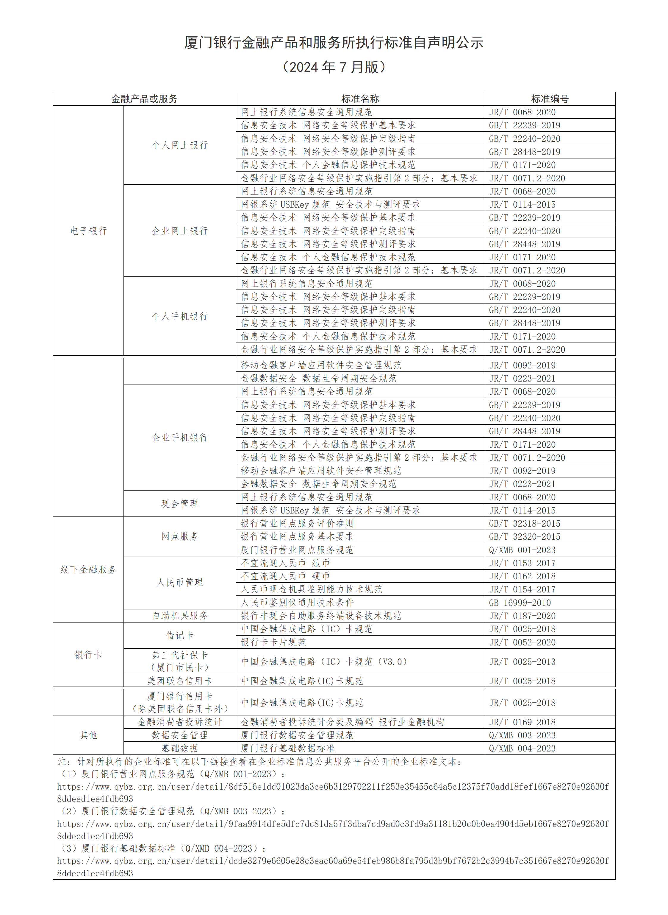 廈門銀行金融產(chǎn)品和服務所執(zhí)行標準自聲明公示(2024年7月)