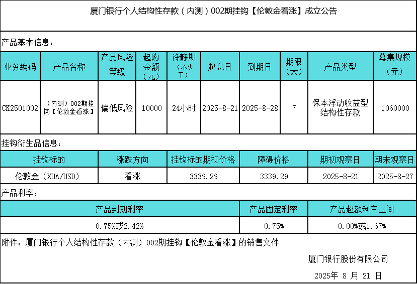 廈門銀行個人結構性存款(內測)002期掛鉤【倫敦金看漲】成立公告 日期:2025-08-22 16:11:41 廈門銀行個人結構性存款(內測)002前掛鉤【倫敦金看漲】的銷售文件_2.zip 返回 下一篇