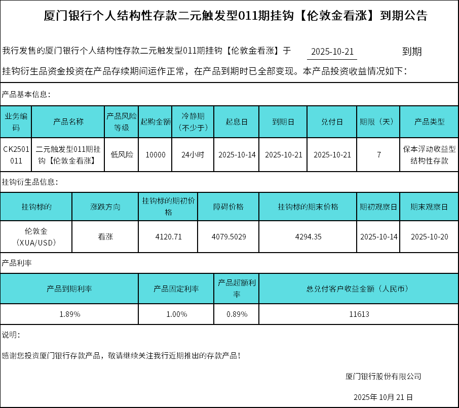 廈門銀行個(gè)人結(jié)構(gòu)性存款二元觸發(fā)型011期掛鉤【倫敦金看漲】到期公告