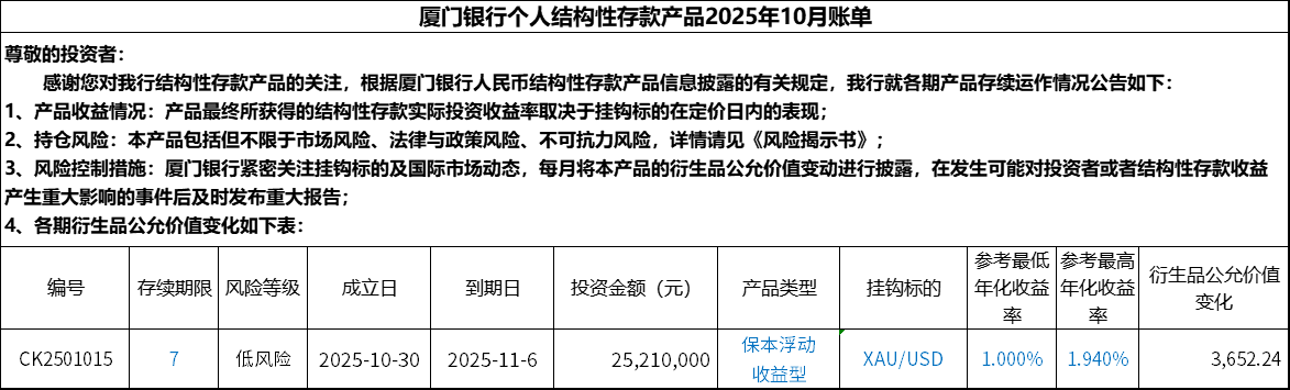 廈門銀行個(gè)人結(jié)構(gòu)性存款產(chǎn)品2025年10月賬單