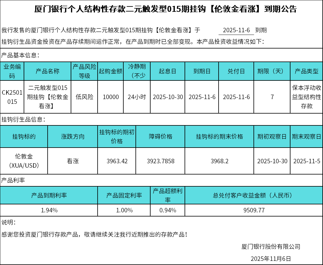 廈門銀行個(gè)人結(jié)構(gòu)性存款二元觸發(fā)型015期掛鉤【倫敦金看漲】到期公告