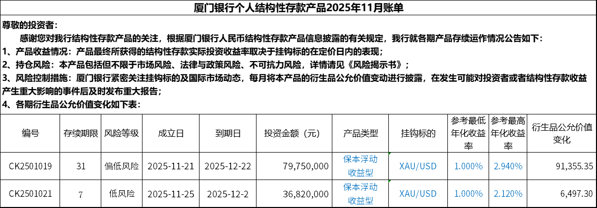 廈門銀行個(gè)人結(jié)構(gòu)性存款產(chǎn)品2025年11月賬單